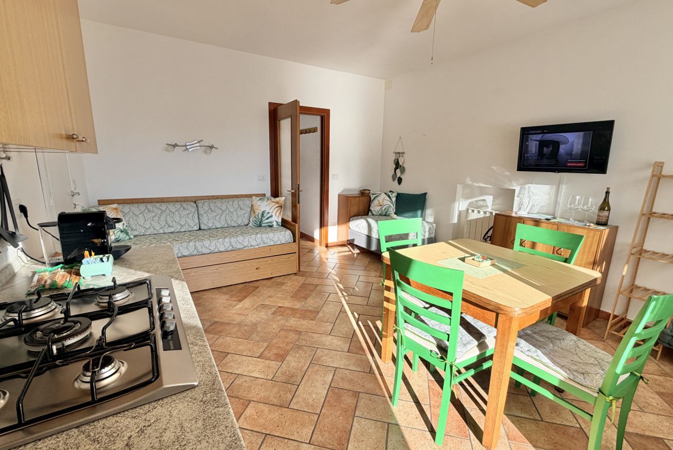 Immersi nella quiete delle colline di Valvarrone, tre appartamenti offrono un rifugio esclusivo con terrazze panoramiche e piscina condivisa. Questa unità è confortevole e funzionale, con camera con letto alla francese, soggiorno con cucina a vista e 2 divani letto singoli. Giardino per il relax e posto auto interno in contesto riservato.